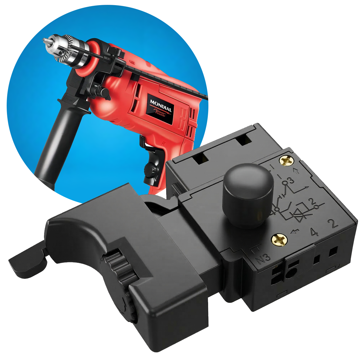 Compatível com a furadeira Mondial NFFI 07 e também com diversos outros modelos de furadeiras elétricas, este interruptor oferece encaixe funcional e instalação simples. É uma peça essencial para manutenção, prolongando a vida útil da ferramenta e evitando a necessidade de substituir todo o equipamento.